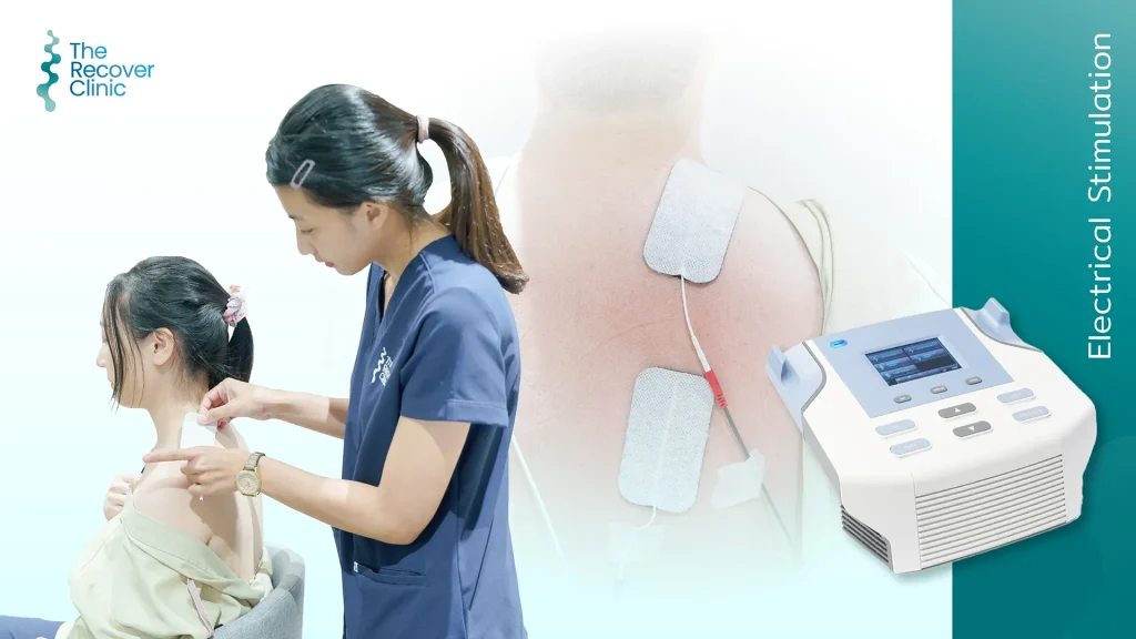 Electrical Stimulation (ES) คือ การรักษาด้วยการกระตุ้นไฟฟ้า โดยการใช้ Transcutaneous Electrical Nerve Stimulation (TENS) กระตุ้นกระแสประสาท ยับยั้งการนำส่งความรู้สึกเจ็บปวดไปยังสมอง เพื่อลดอาการปวด