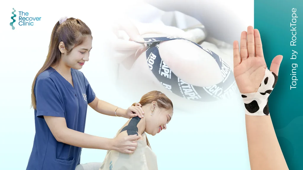 Taping technique by Rocktape เป็นเทปผ้าที่ถูกออกแบบมาให้มีความยืดหยุ่น นำมาประยุกต์ใช้ในกลุ่มอาการปวดของออฟฟิศซินโดรมและนักกีฬา โดยมีจุดประสงค์เพื่อ